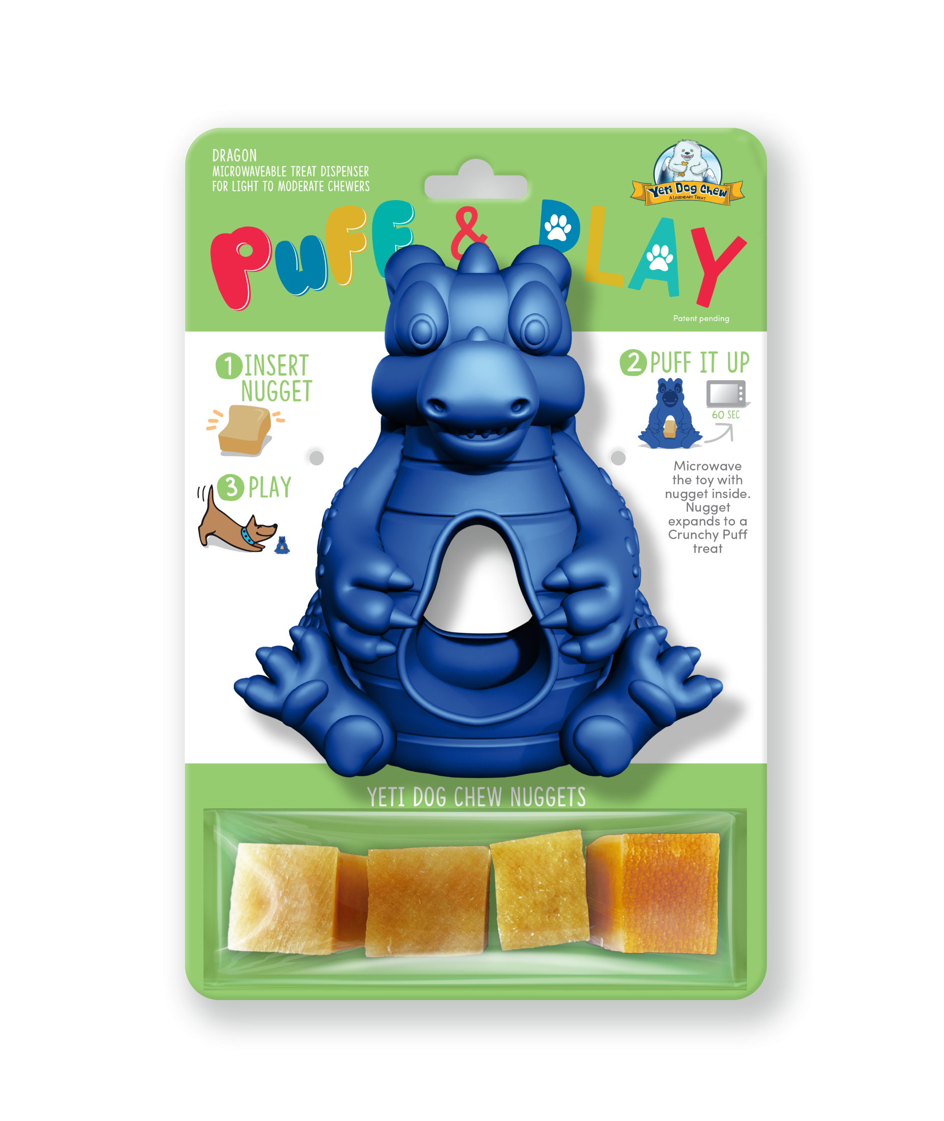 Pop the nugget into the toy, give it a quick 60-second spin in the microwave and watch it puff up to twice its size, transforming into a crunchy treat!